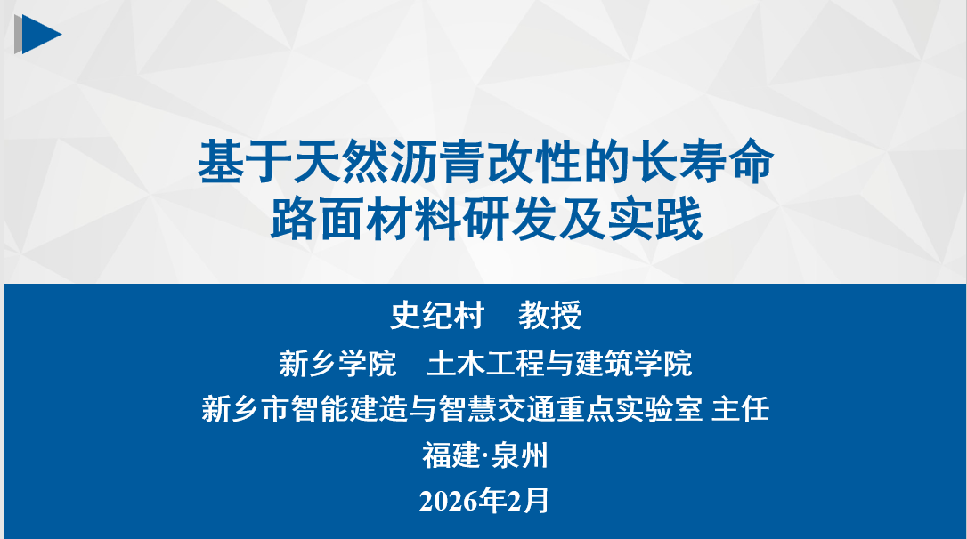 2026年2月4日-6日,由中国市政工程学会主办的新型长寿命路面建设与养护新技术新材料应用研讨会在福建泉州成功举行。本次会议汇聚了100余名国内道路工程领域的专家、学者与企业代表,共同探讨路面技术创新与可持续发展路径。会上,我院史纪村教授代表团队做的基于天然沥青改性的长寿命路面材料研发及实践专题报告,受到与会者的高度关注与热烈讨论。