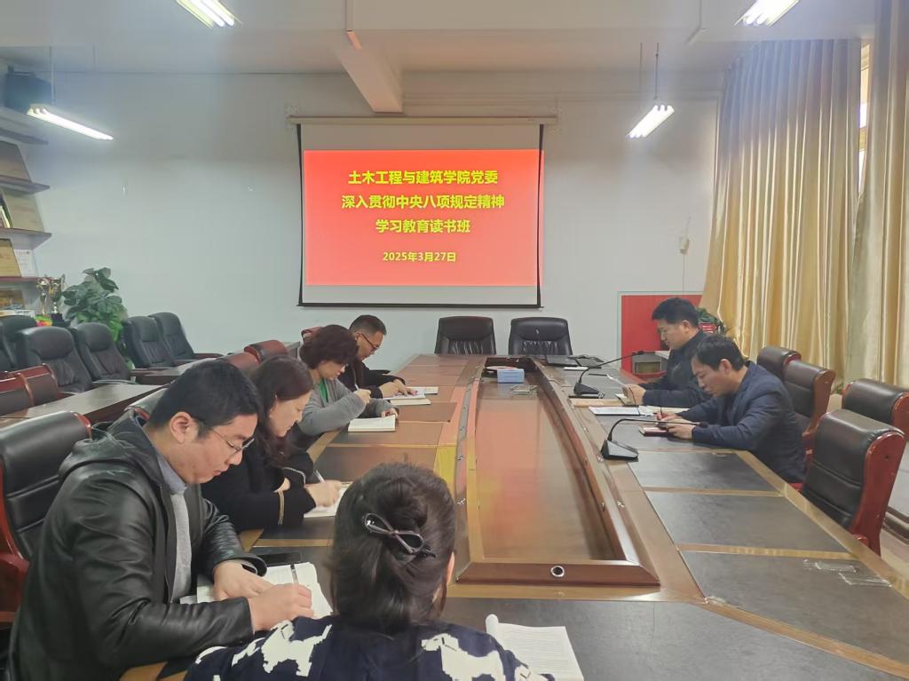 为进一步提升党员干部的政治素养,强化作风建设,引导全院党员干部贯彻中央八项规定及其实施细则精神,切实改进工作作风,推动学院各项工作高质量发展。3月27日上午10点,土建学院在A09-314会议室举办了深入贯彻中央八项规定精神学习教育读书班活动。学院党委理论学习中心组全体成员参加学习。
