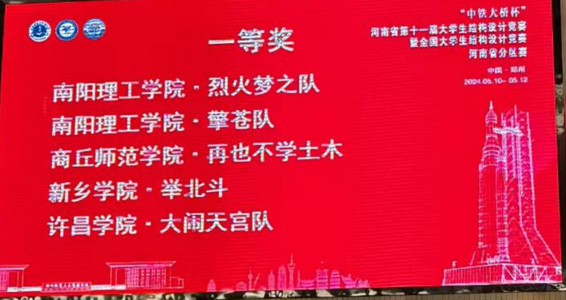 5月10日至12日在郑州航空工业管理学院举办的河南省第十一届大学生结构设计竞赛暨全国大学生结构设计竞赛河南省分区赛中斩获一等奖1项、三等奖1项。