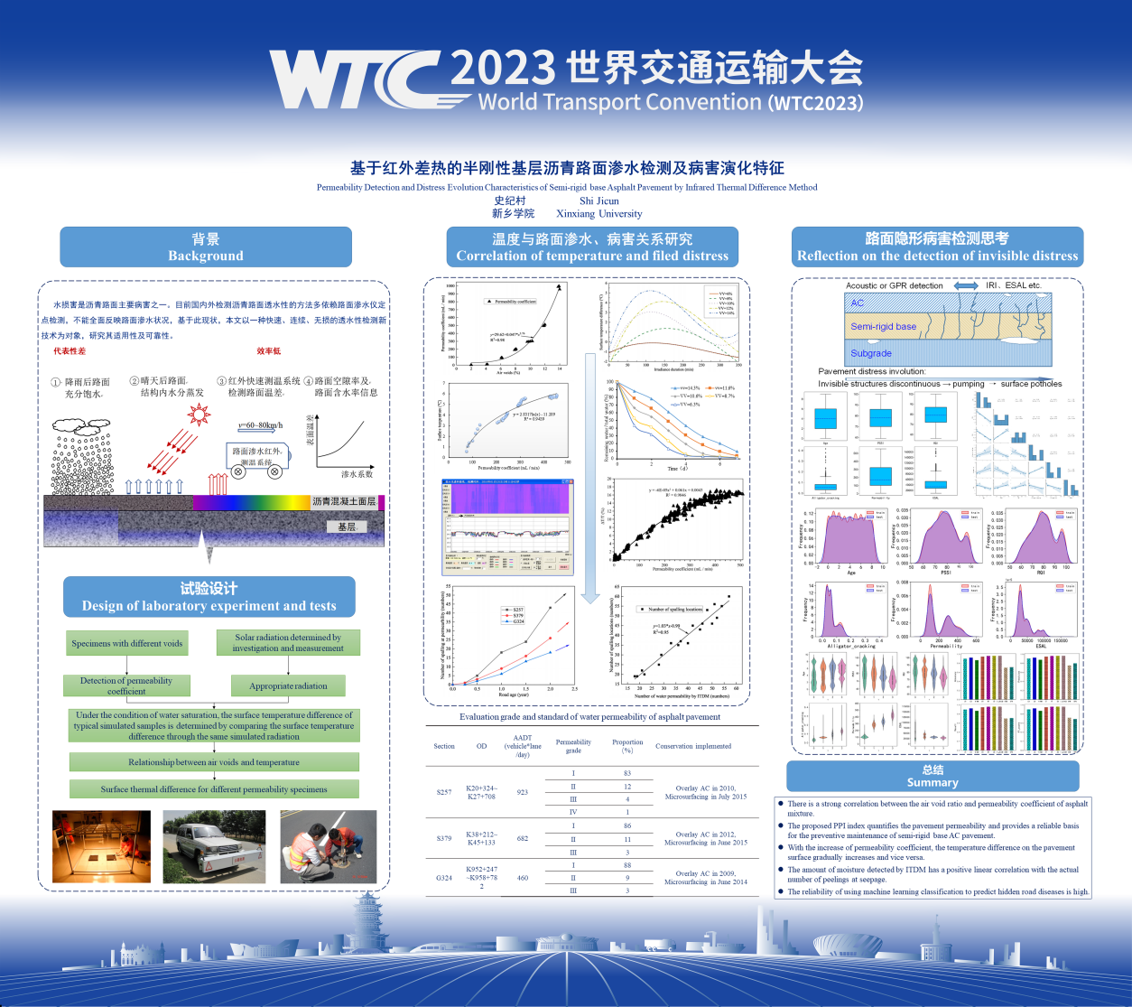 我院史纪村教师受邀在会上分享了“基于红外差热的半刚性基层沥青路面渗水检测及病害演化特征(Permeability Detection and Distress Evolution Characteristics of Semi-rigid base Asphalt Pavement by Infrared Thermal Difference Method)”的报告。该研究采用红外热差法(ITDM)对SBAP的渗透率检测进行了研究,以确定温差,从而获得其渗透率和病害演变特性。该研究项目通过设计沥青路面试件的空隙、热差和渗透性,计算得出含水量变化对路面温度的影响;采用专用检测车进行现场热差测试,并测量了路面破坏以与渗透响应对比。报告会后,参会代表们对该研究内容表示出浓厚兴趣,开展了热烈讨论。通过该次交流汇报,有效提升了我院道路工程学科在国内外的影响力。