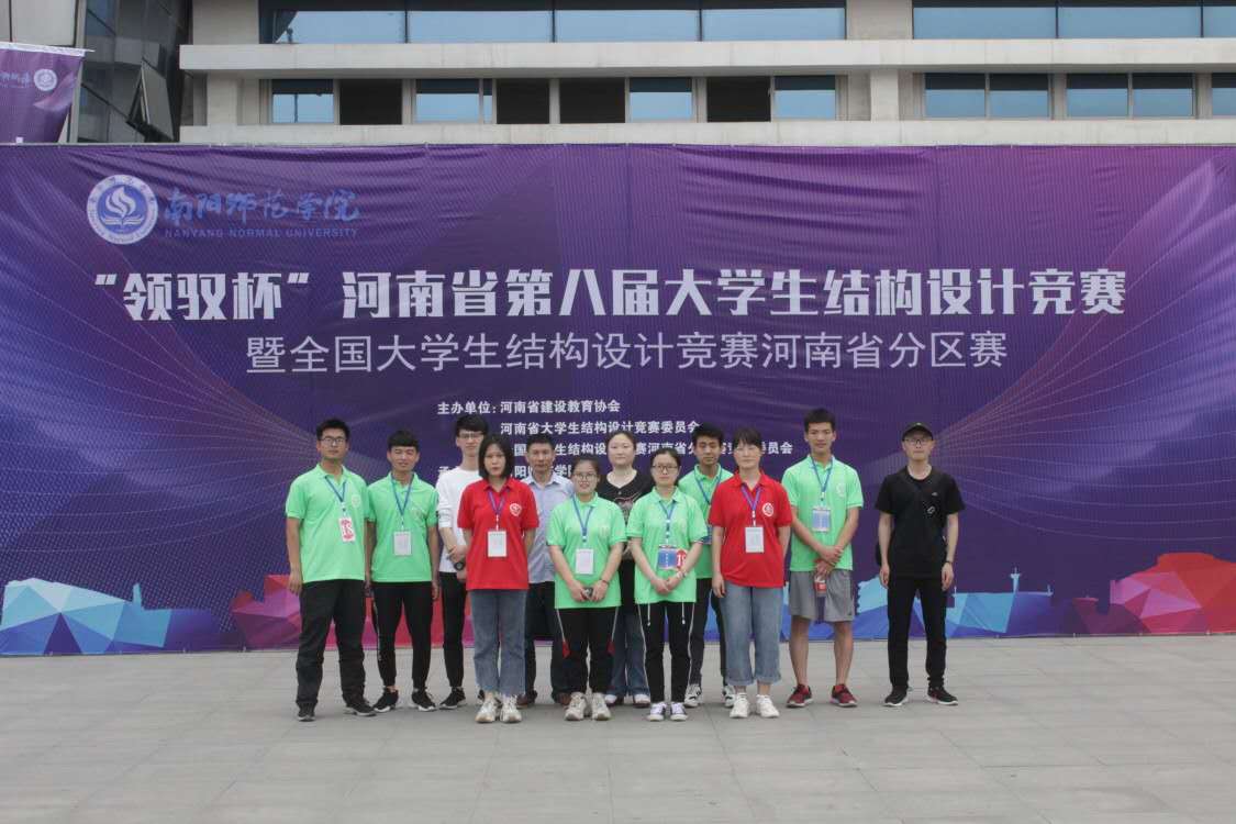 2019年5月17日至5月19日,我院参加了“领驭杯”河南省第八届大学生结构设计竞赛暨全国大学生结构设计竞赛河南省分区赛。位亚辉、吴昕哲、徐淑倩、张泽世、葛胜胜、王世源、尚燕、李志浩八人共同前往,由我院申道明老师和杨蕊老师分别指导两组。
