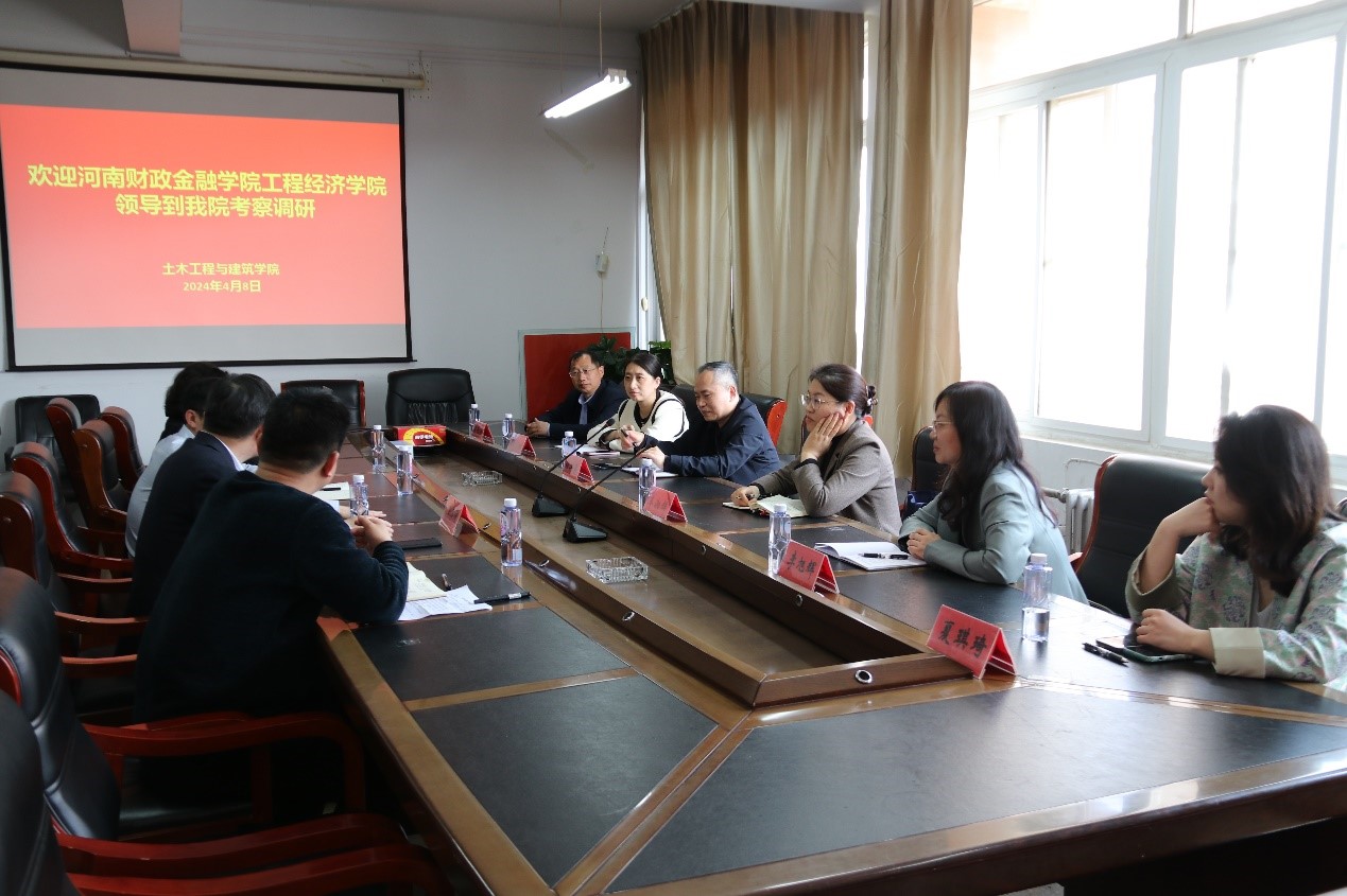 4月8日下午,河南财政金融学院工程经济学院党委书记车湘辉、院长杜兴亮等一行到betway西汉姆联官网进行调研。新乡学院校长王孝俊参加了调研交流。betway西汉姆联官网党委书记汤沛、院长潘林及部分科级干部参加了交流座谈。