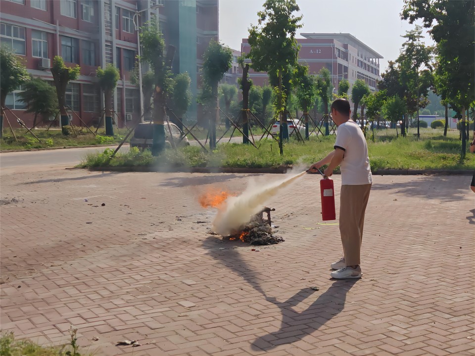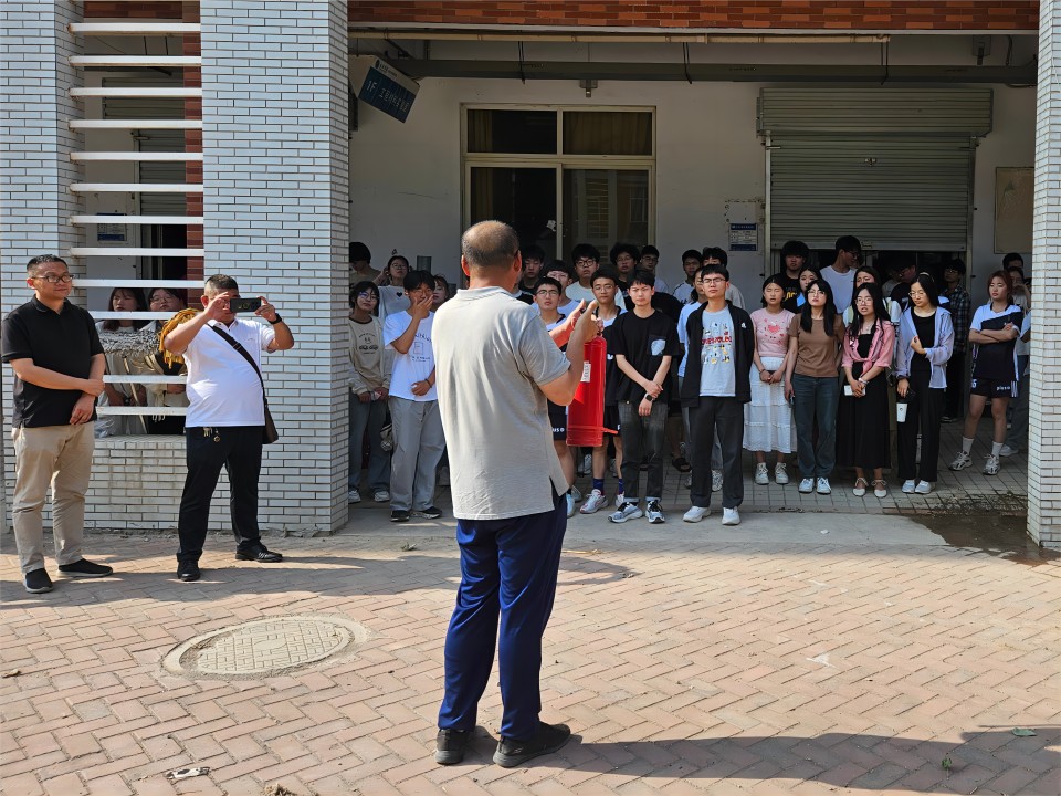 演练开始之前,黄永毅向参加演练的学生介绍了疏散路线和逃生注意事项,强调要做到听从指挥,有序疏散,确保安全。火灾警报响起后,学生们沉着冷静,捂住口鼻、低头弯腰,在辅导员的组织下有序地进行紧急疏散,迅速撤离。实验室管理员立即切断电源,模拟火灾初期的灭火工作,防止火势扩大蔓延。学生们撤离到安全地点后,张勋程老师清点了人员数量和伤情,并向总指挥汤沛汇报疏散情况。随后,保卫处人员向学生讲解了灭火器的灭火原理、使用方法及注意事项,并指导学生现场灭火。