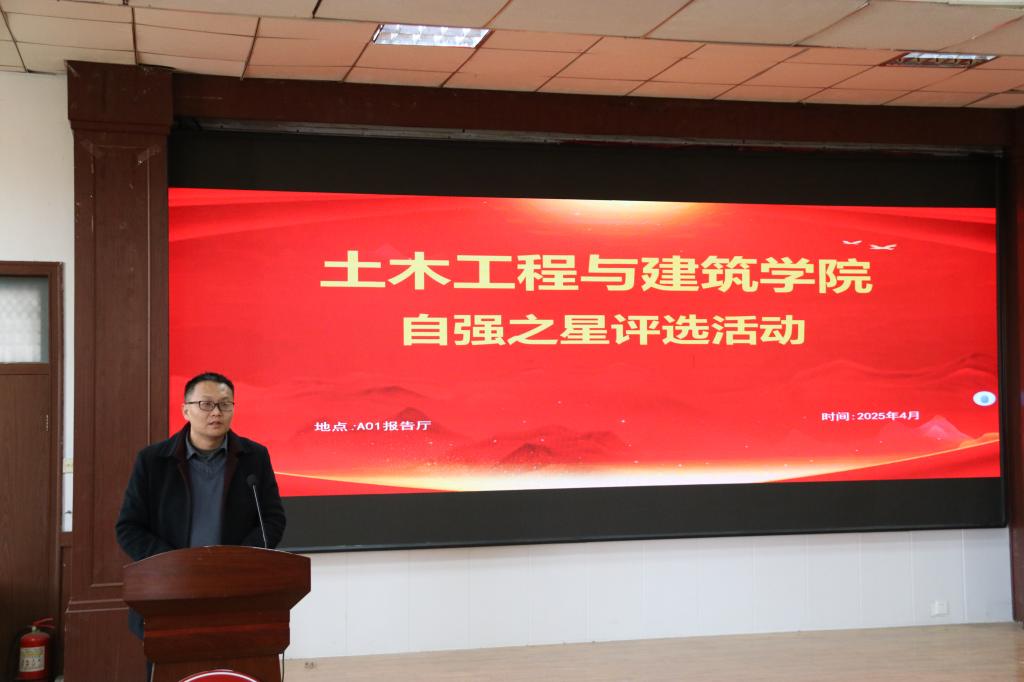 活动开始由袁大伟致辞,他提出“自强”是镌刻在中华民族血脉中的精神密码,更是新时代青年最鲜亮的底色。随后在主持人的主持下,参赛人员依次上台演讲,他们分别是:刘雪莹、李想、张楚、岳远佳、费露凡、王春美、孟繁楚、李佼佼。各位同学的演讲各具特色,情感真挚,思考深刻。他们结合亲身经历指出:天行健,君子以自强不息。在前行的道路上,无论遇到多少困难,只要心怀梦想、脚踏实地,就能创造属于自己的精彩人生。经过各位评委老师的打分后,刘雪莹、李想、岳远佳、王春美、孟繁楚、李佼佼六位同学获奖。袁大伟期望土建学子们能以“自强之星”为榜样,在未来的日子里,凭借坚定的信念,在面对学业的重重挑战时不退缩,在探索未知的征程中不懈怠,成长为可堪大用的栋梁之材,书写无愧于时代的壮丽篇章。